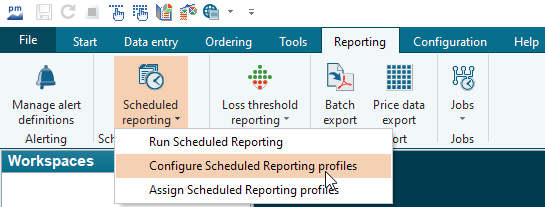 On the "Reporting" tab in the ribbon, select the CONFIGURE SCHEDULED-REPORTING-PROFILE command in the menu of the "Scheduled Reporting" icon.