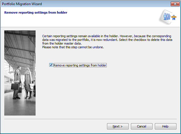 On this page you can decide whether the reporting settings should be removed from the holders and thus only be made in the portfolio. This step cannot be reversed. Once you have carried out this step, this page will no longer appear in the wizard.