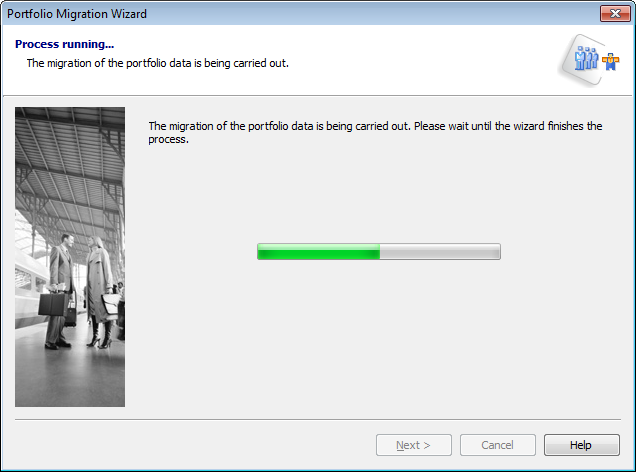 A progress bar runs here during the migration. Current information about the migration. Once this is complete, the next page of the Portfolio Migration Wizard will appear.