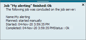 Regardless of the e-mail notification, messages are displayed to the user who is logged into Infront Portfolio Manager in an automatically appearing notification window. This window is temporarily displayed at the bottom right of the screen near the taskbar. The information about the completed job is also listed here.