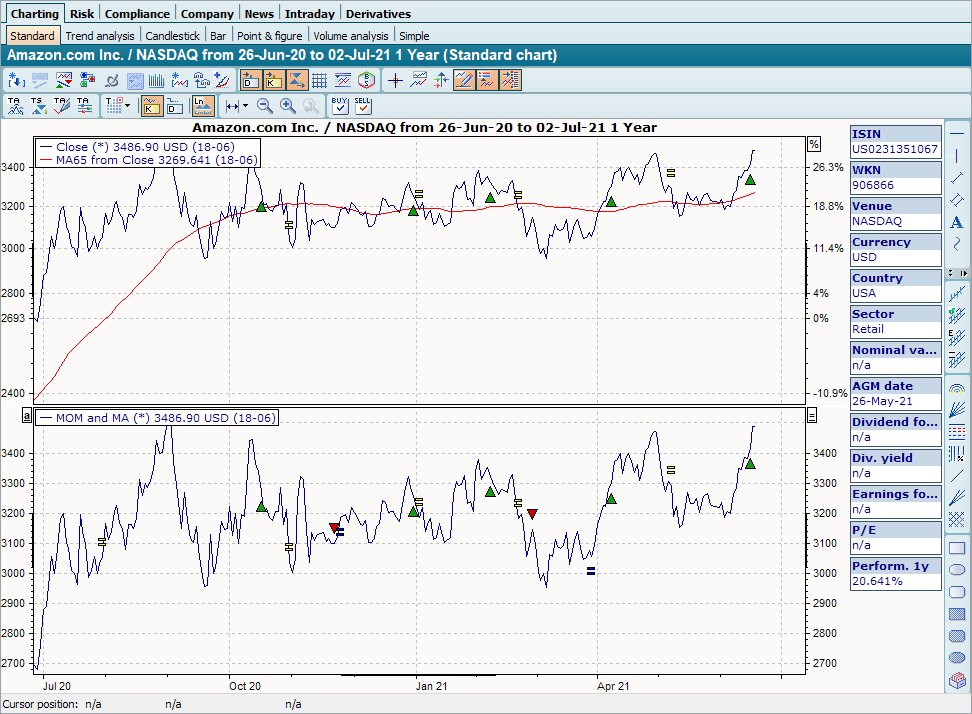 Select a trading system from the list. The trading system is then displayed in a new chart in the chart window. The trading signals are also displayed in the price history if no other trading system was previously assigned to the price history.