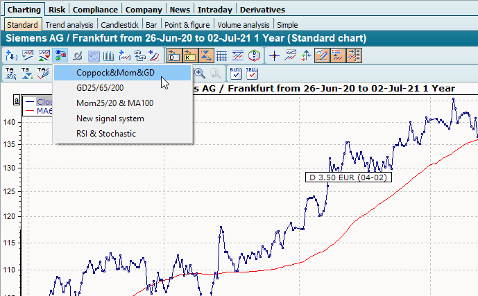 Select the desired system from the list. The signal system is then displayed in the chart window. In addition, the trading signals found are displayed in the price trend, provided no other trading system has been assigned to the price trend to date.