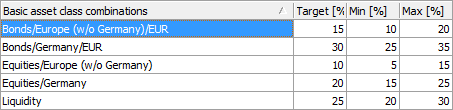- To change the target value or the minimum and maximum permitted deviations of a basic asset class combination, open the "Asset Allocation" window, which you can access via the properties window of a portfolio.