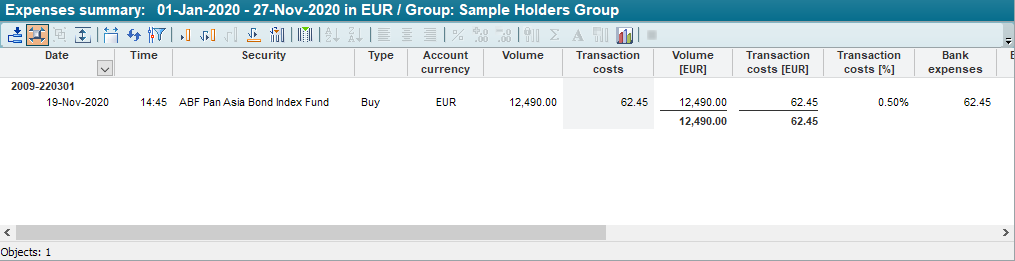 You can start the expense overview from a holder or portfolio (for all custody accounts of the holder or portfolio) or from a custody account (only for this custody account).