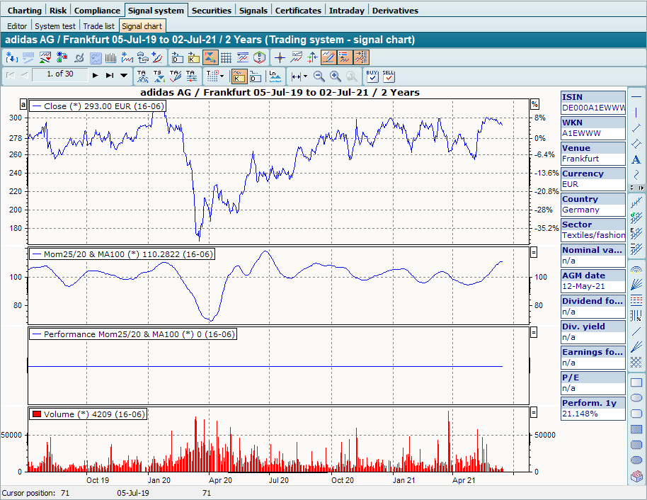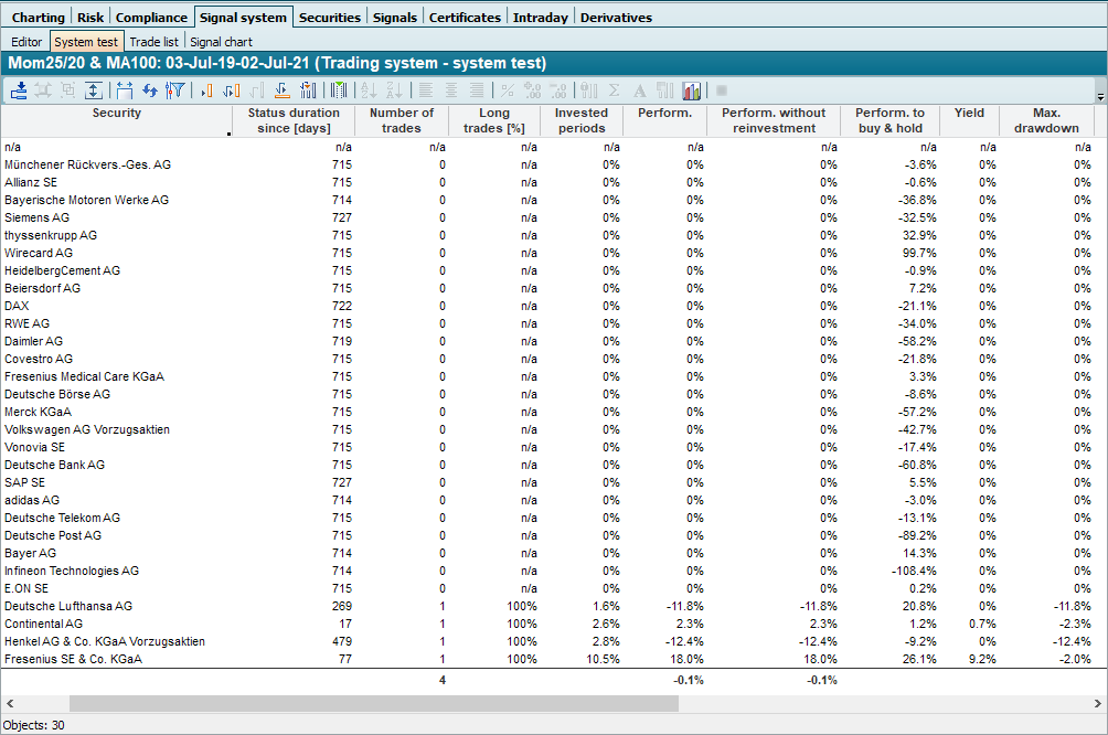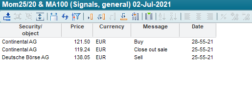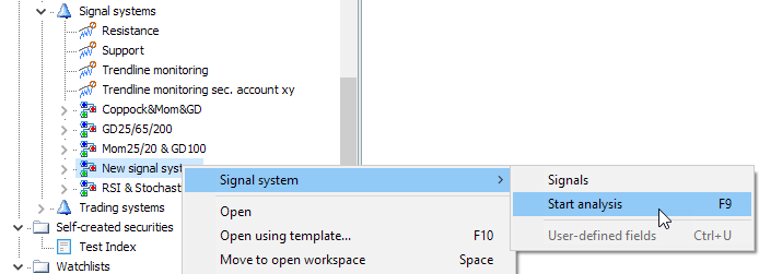 Once you have defined the parameters and entered the securities to be monitored under the "Input" object (under "Signal system") in the Explorer, you can start the evaluation for these securities.