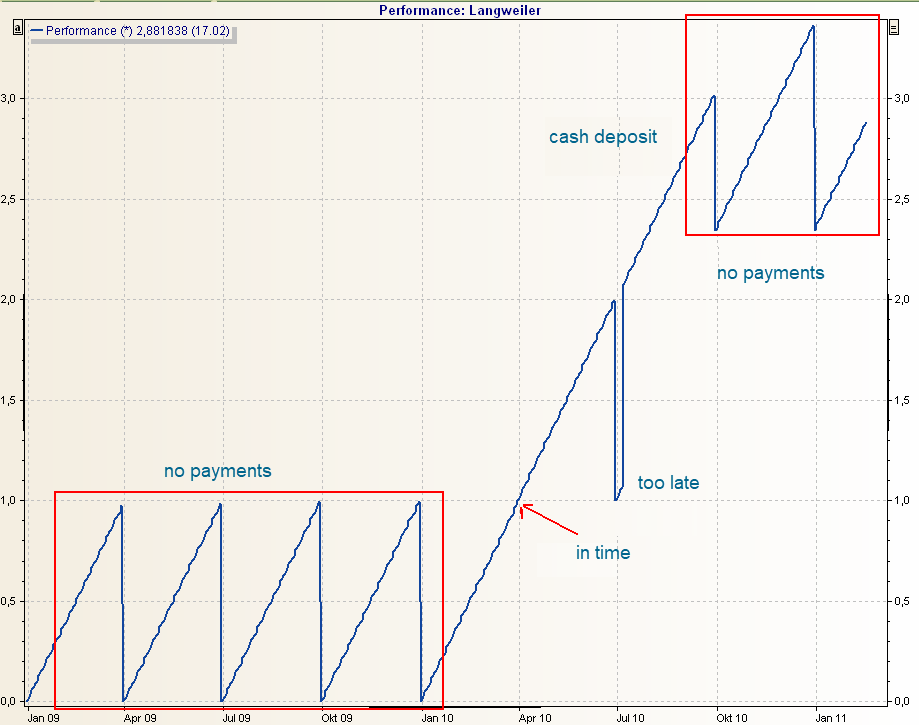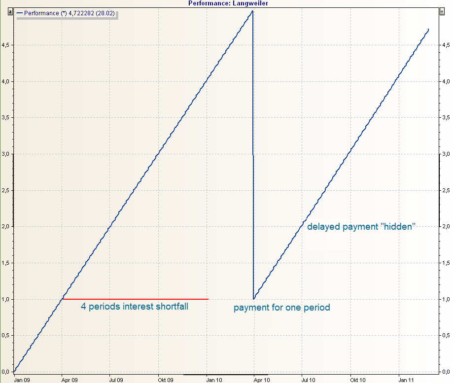 The illustration shows the performance of an overnight deposit with "inappropriate" interest payments. A method that takes into account interest payments and avoids such "jags" is desirable.