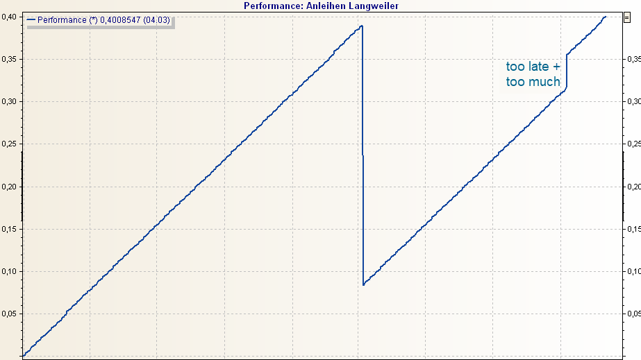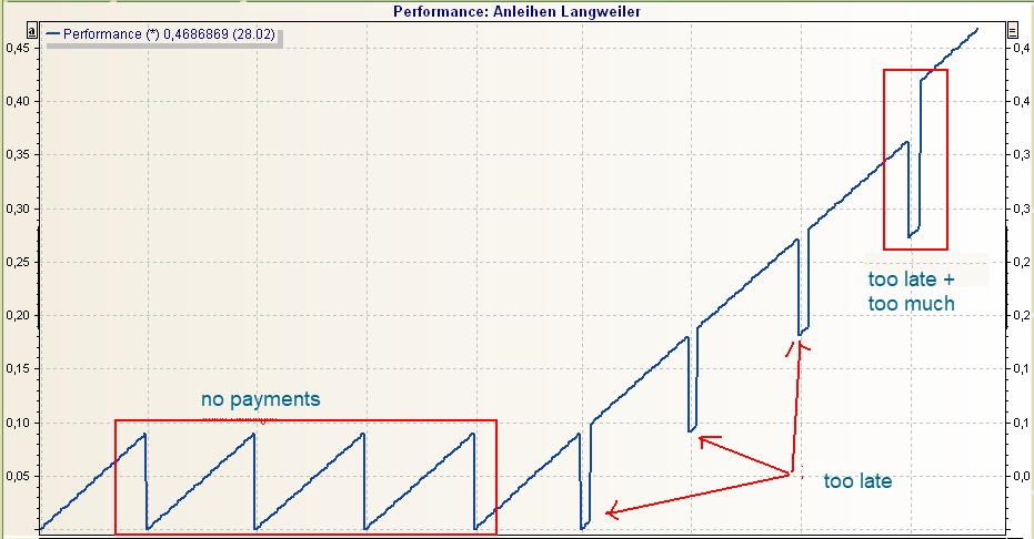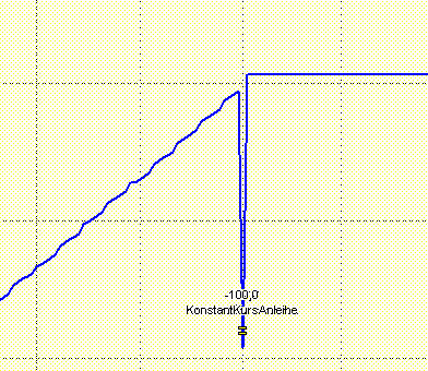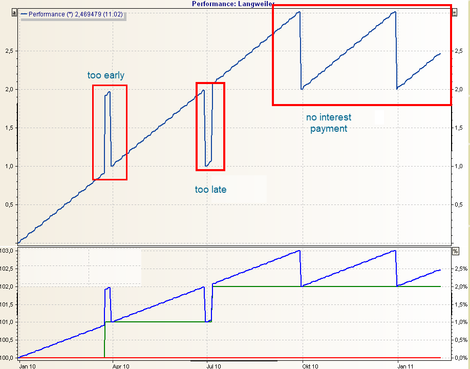 Payments made up to 8 trading days before the actual interest payment date are added to the upcoming date. Accrued interest is set to 0 on the payment date. This looks like a staircase in the performance chart. The payment is too large, as it is for several days in advance, and the performance does not change until the interest payment date. It follows from this: The trend is initially steeply upwards and then horizontal until the interest payment date. Then back up again linearly.
