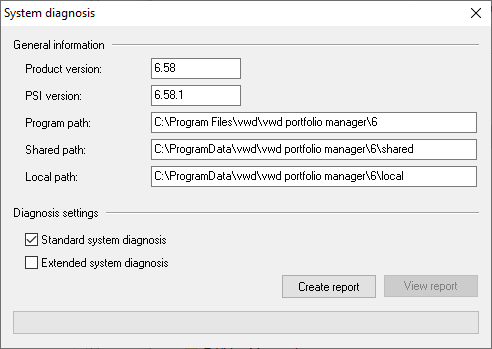Extended system diagnostics | The extended system diagnostics provide more detailed information than the standard system diagnostics. The results are evaluated further, access rights and registry entries as well as the database connection are checked, etc. The extended System diagnostics can be useful directly after installing the program, for example. Activate the "Extended system diagnostics" checkbox, which is deactivated by default, if you want to perform this. |