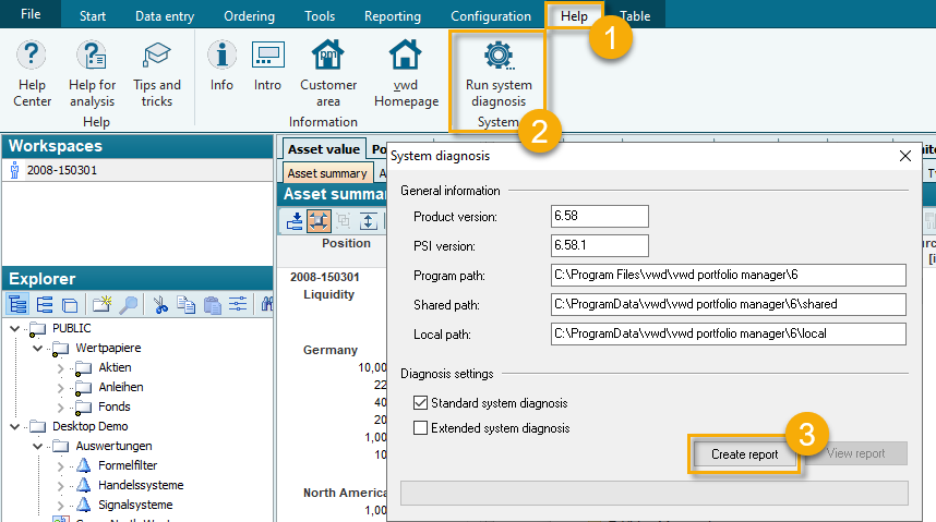 In the Infront Portfolio Manager you have the option of carrying out a system diagnosis. There are two different ways to start the system diagnostics: