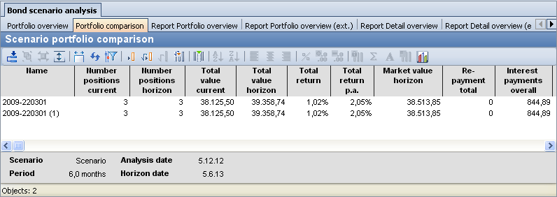 You can use this table to compare portfolio variants of the current scenario with each other and see very quickly how changes in the portfolio variants (e.g. purchases or sales) are reflected in the most important key figures. All key figures are available both for the evaluation date ("current") and for the set horizon date.