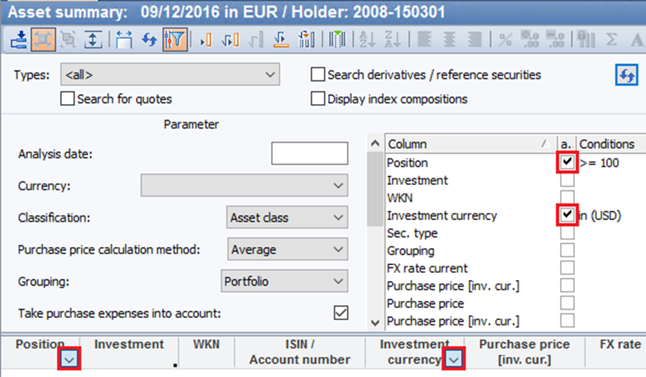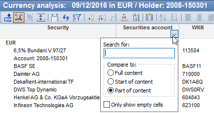 You can filter all tables in the Infront Portfolio Manager. In addition to the filtering options described in detail in the following subsections via the parameter and filter field, which you can display via the "Show parameter and filter settings" icon or via the <CTRL>+<A> key combination at the top of tables, there is also an alternative, quick filter option: