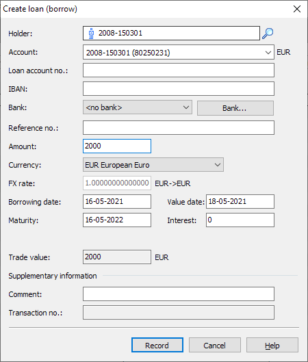 This dialog box largely corresponds to the "Invest fixed-term deposits" dialog box. However, there is no field for the interest calculation method for loans and the amount in the account is of course positive (fixed-term deposits are negative). - Complete or change the information in the input fields if necessary.