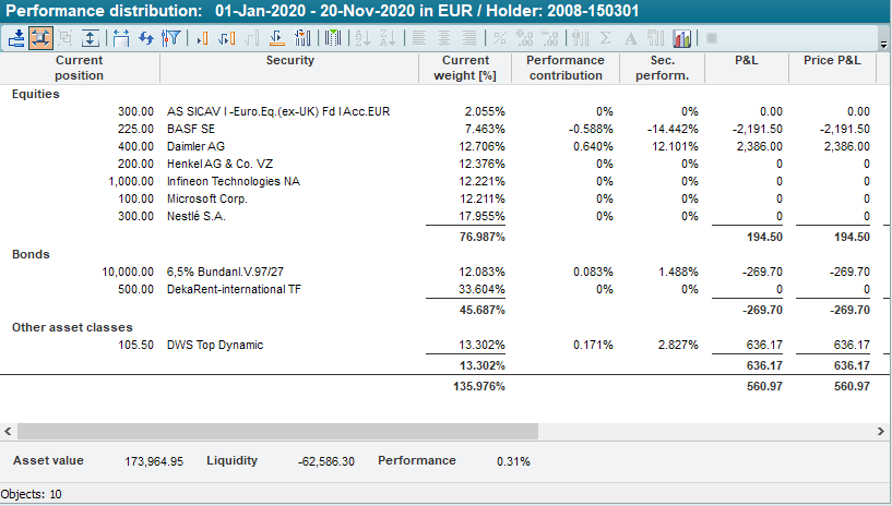 Asset class | The performance distribution is segmented according to this column by default. Use the "Classification" parameter to select a different entry - region, segment or currency class - and then select the "Update" icon to change the segmentation. The "Asset class" column is then replaced by the selected segmentation type (e.g. "Region" column). |
