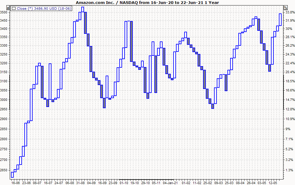 By default, after the display of three consecutive white blocks, the lowest closing price of these three blocks must first be undercut in order to draw a gray block. Conversely, if there are three consecutive gray blocks, the highest price of the last three blocks must first be exceeded in order to draw a new white block.