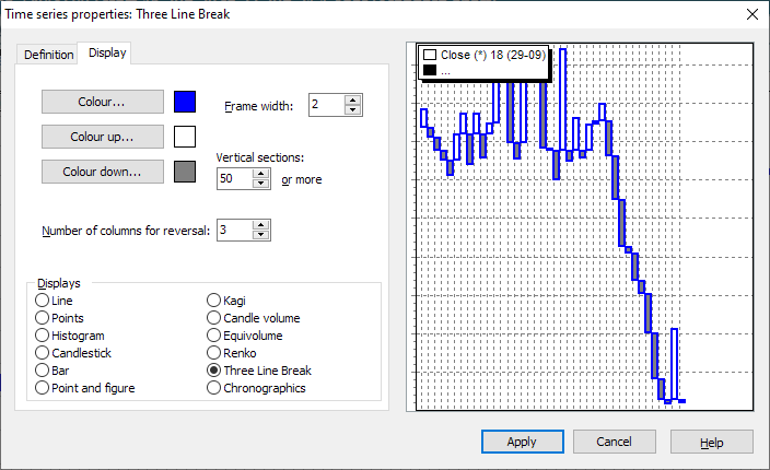 - To display a time series as a three-line break chart, mark the price trend.