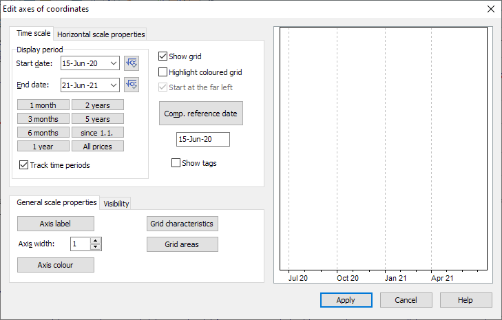 - In this dialog box, the settings for the time axis are displayed on the "Time scale" tab. You can change these options by clicking on the fields or checkboxes.