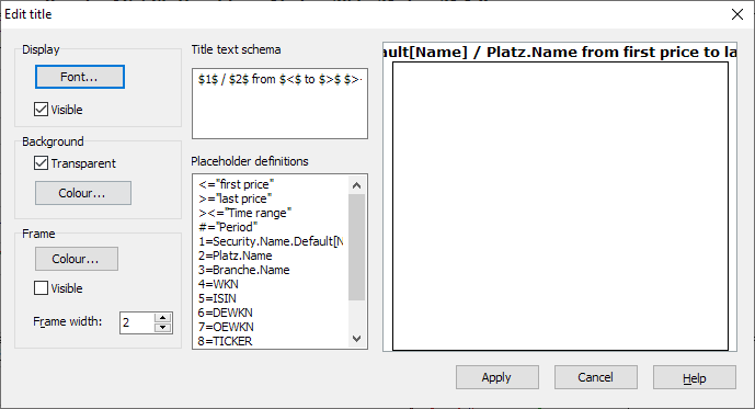 Title text scheme | You can define dynamic headings here. The field below contains the definitions of the placeholders. Enter the placeholders between two "dollar signs" (e.g. $1$ for "Name", i.e. the name of the security, or $><$ for "Time range", i.e. to display the length of the chart section in days, weeks, months, $5$ for the ISIN, etc.). You can insert any characters or text in between (space, hyphen, etc.). |