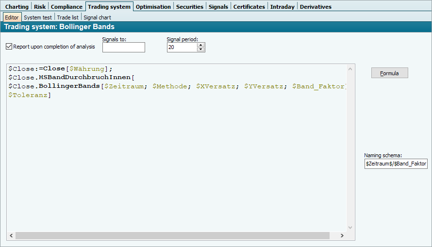 To change a trading system, select the PROPERTIES command in the context menu of the trading system in the Explorer or double-click on it. In both cases, the workspace of the trading system opens. If the trading system is not visible in Explorer, enter the name in the search and search for folders. You then open the workspace of the trading system by double-clicking on the hit in the search result. The editor with the trading system properties opens in the workspace of the trading system. The "Formula" button takes you to the formula editor.