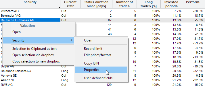 The following functions, for example, are available via the context menu of the table rows: