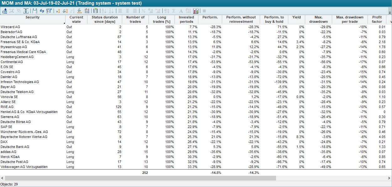 Open the workspace of the trading system. The system test table is started for the objects listed under "Input" and shows a selection of the most important key figures. You can find these in the workspace on the "Trading system" tab.