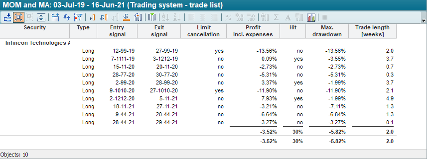 The trade list is started for the objects listed under "Input" and shows the trades in the evaluation period.