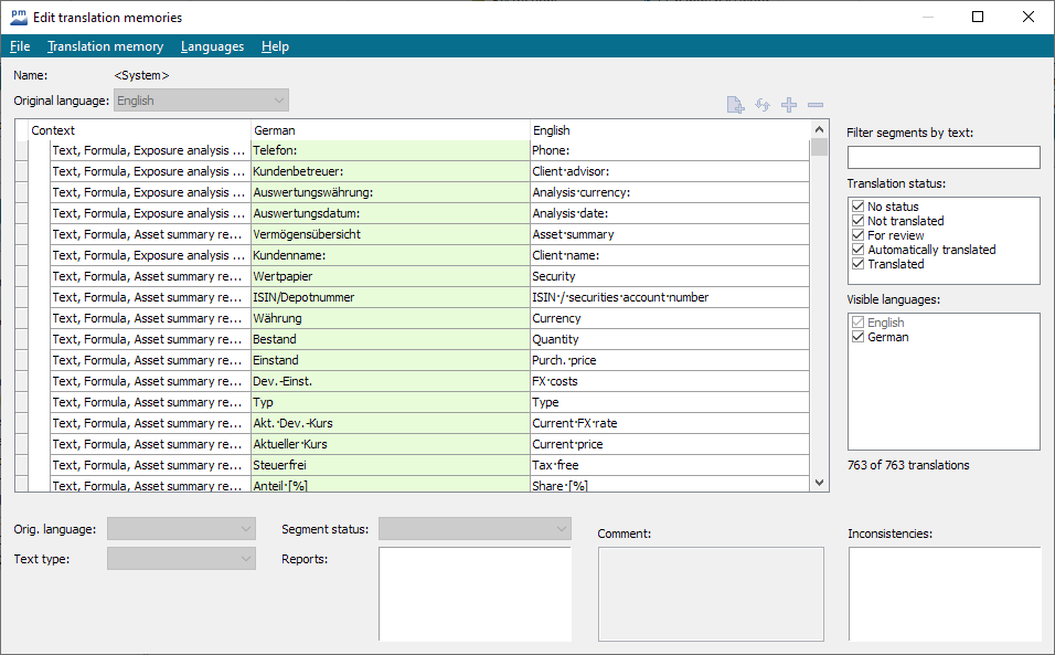 The TM "System" is the delivered standard translation memory of your Infront Portfolio Manager and cannot be edited directly. To create an individual TM based on this TM, open the "System" TM and save it under a different name. You can then determine the order of the TMs via the prioritization .