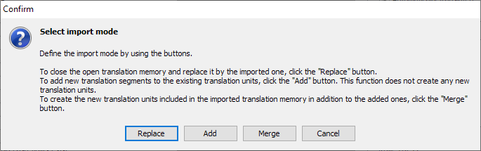 To create the new translation units contained in the imported translation memory in addition to additions, select the "Merge" button.