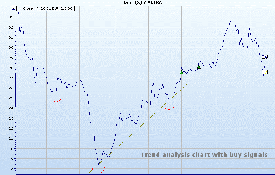 The "Trend signals" icon can also be used to draw the trading signals generated by the trend analysis into the previously marked price development.