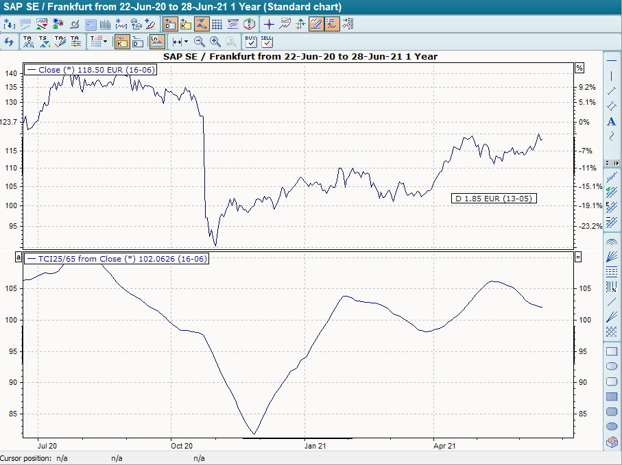 The TBI attempts to confirm a trend already recognized by a GD with the help of a second GD. The two GDs, generally a short and a medium-term one, are divided for this purpose. The resulting ratio therefore fluctuates around the zero line.