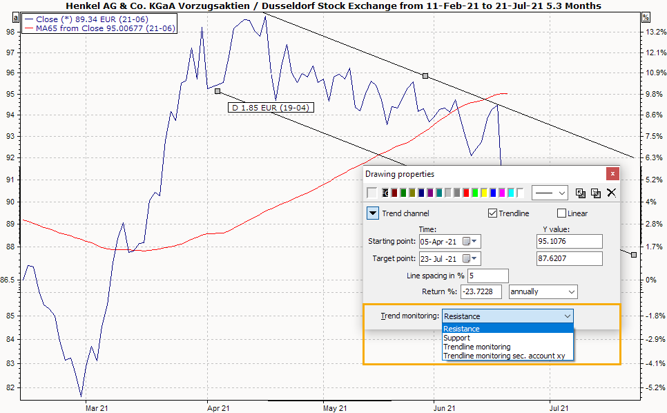 Trend line monitoring must always be started manually; automated evaluation after reading in the price data is not possible. Read the following section Start evaluation of trend line monitoring.