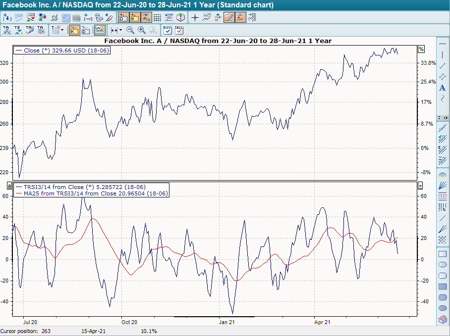 Another option is to calculate a GD on the TRSI and use the intersection of the two lines as a signal generator. A buy signal is given when the TRSI crosses its GD from bottom to top, a sell signal when the TRSI crosses its GD from top to bottom.