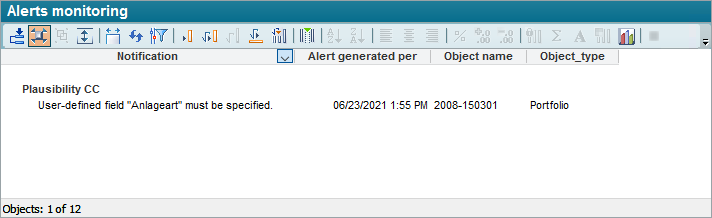 The standard template "Monitoring alerts" is available for displaying alerts. You will find this table in the "Monitoring" template category when delivered. This evaluation is available for all depot objects and for depot filters.