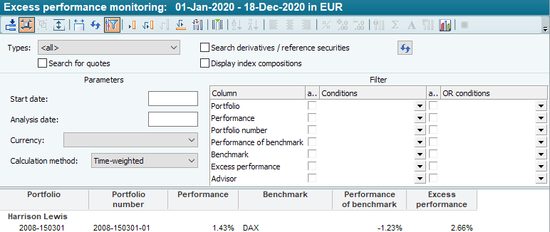 You will find the monitoring of excess performance (in the delivery state) in the workspace of groups, holders, portfolios and securities accounts on the worksheet "Monitoring", "Excess performance".