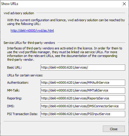 In the open server configuration tool, select the command CONFIGURATION, SHOW URLs in the main menu to display important Internet addresses. If you have a license for the Infront Advisory Solution, you will see the URL to the Infront Advisory Solution. You will also find service URLs for third-party interfaces activated in your license.