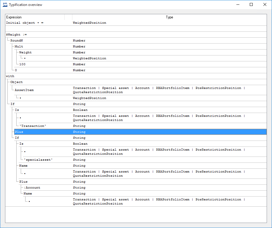 The overview shows all variables and the types determined for them. The list also shows the type of the initial object of the formula.