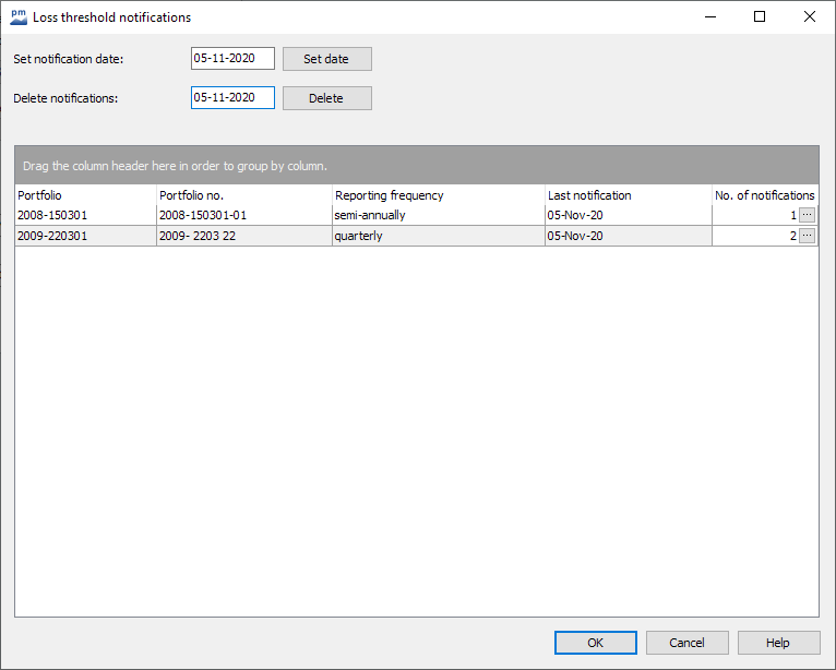In the "Loss threshold notifications" dialog box, you will find the "Set notification date" and "Delete notifications" input fields at the top with the corresponding "Set date" and "Delete" buttons.