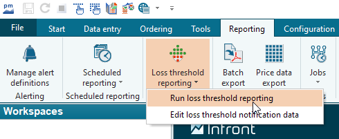 On the "Reporting" tab in the ribbon, select the command EXECUTE LOSS THRESHOLD REPORTING in the menu of the "Loss threshold reporting" icon. The "Perform loss threshold reporting" dialog box appears in which you can make your settings.