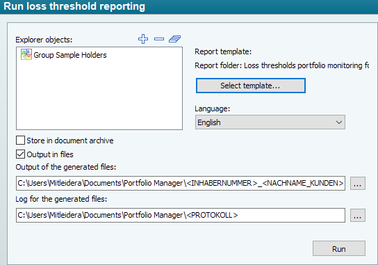 If you have assigned loss thresholds to portfolios via a portfolio version in the Portfolio properties or via a portfolio profile and monitor these, then organize the execution of reporting with regard to these loss thresholds using the "Loss threshold reporting" function. Proceed as follows: