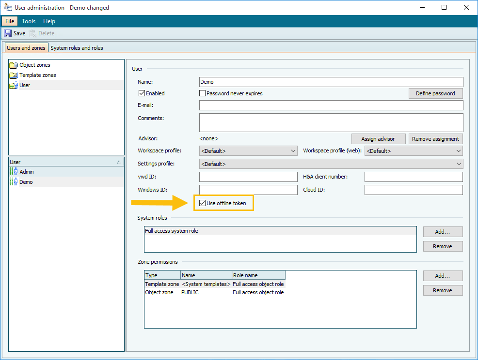 Proceed as follows to activate the use of an offline token for a user: