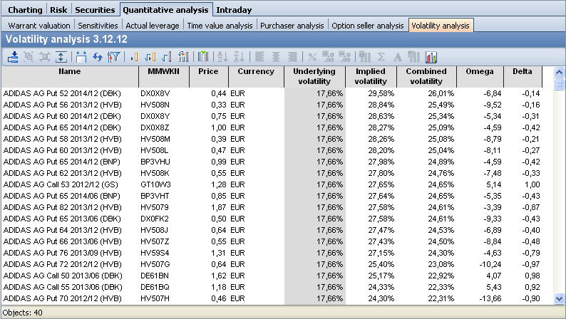 Omega | The omega of the option or warrant. The omega indicates the percentage change in the option value assuming an underlying change of one percent. Omega is therefore a key figure that estimates the future leverage of an option. Due to the lower price, the option reacts more strongly in percentage terms than the underlying asset. |
