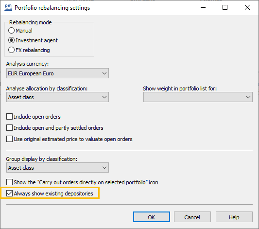 In the settings for portfolio rebalancing, you can specify that depositories are also displayed in the position overview if there is only one relevant depository for securities in a securities account. To do this, activate the "Always show existing storage locations" checkbox in the settings .