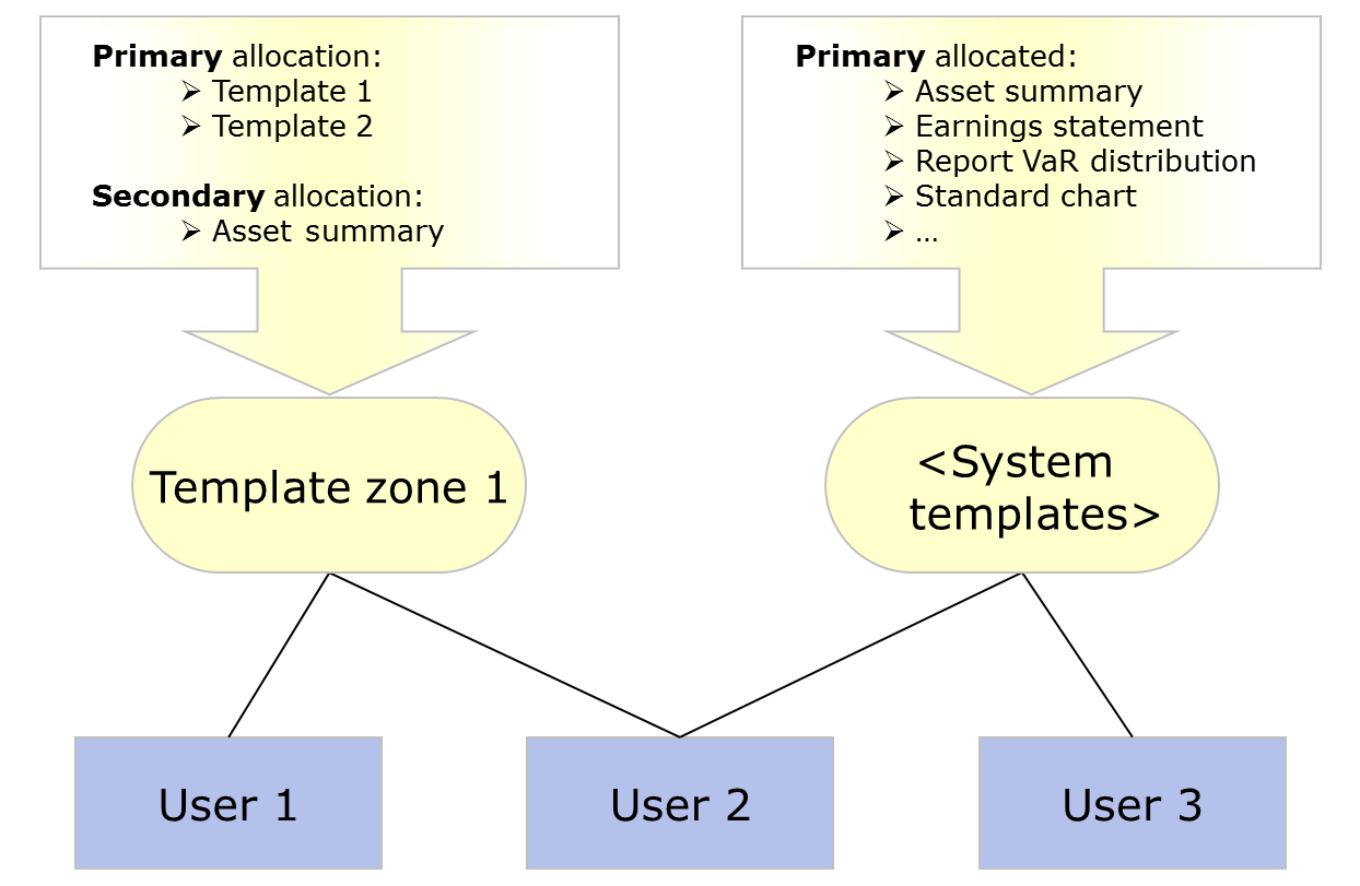 In this simple example, there are two template zones and three users. Only "User 2" and "User 3" can see the standard templates from the "<System templates>" template zone. "User 1", who is only assigned to "Template zone 1", can only see the "Asset overview" in addition to the two templates primarily assigned to this template zone ("Template 1" and "Template 2"), as this is assigned secondarily to "Template zone 1". However, it cannot edit them. "User 2" is assigned to both template zones and can access all templates. "User 3" does not see the templates that are assigned to "Template zone 1".
