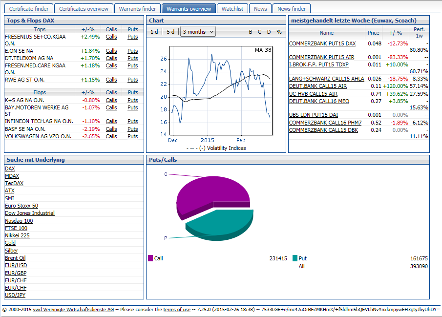 A mouse click on the links "Calls" or "Puts" opens the warrant finder for warrants on this DAX value.