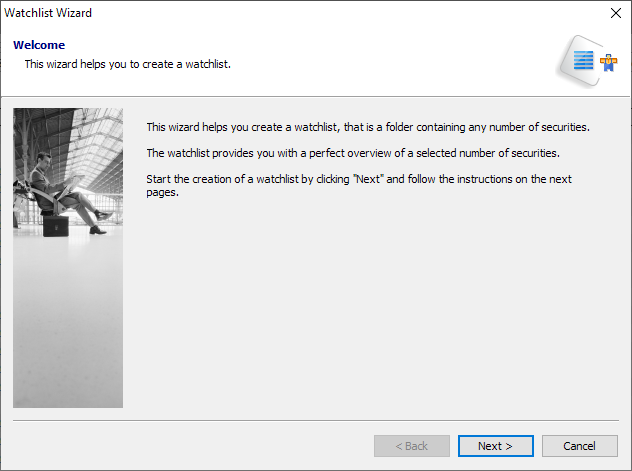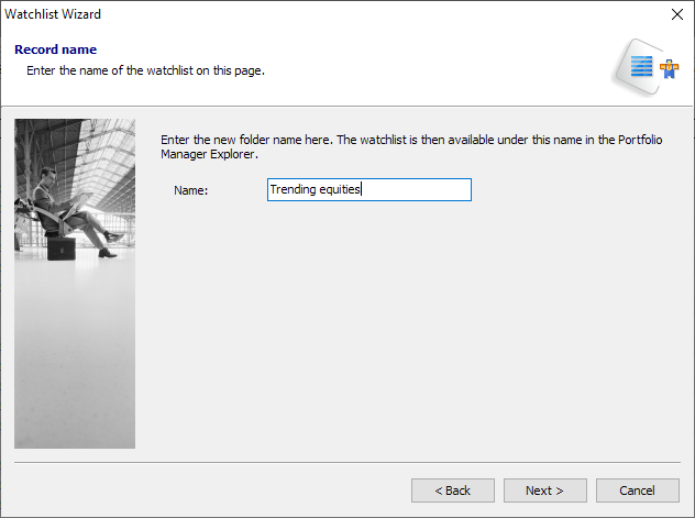 - Click on the "Next" button to go to the next page. Now enter the desired name for the watchlist here. You will later find the securities folder under this name in the Explorer.