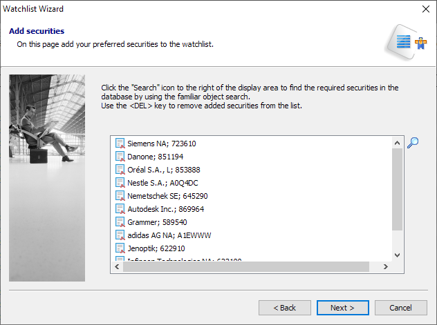 - Add the securities on the next page. To do this, use the search icon on the right-hand side of the dialog window, which opens the familiar object search, and double-click on the matching hits in the search result.