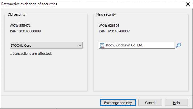 In the selection list on the left in the "Old security" field, search for the security to be exchanged among all of the holder's securities. You will then receive more detailed information (WKN, ISIN) on the selected security in the dialog box. You can also see the number of transactions affected.