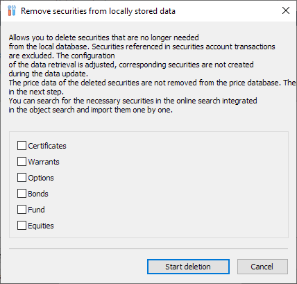 You have the option of deleting entire security types from the database if they are included in your data subscription but you do not (currently) need them. Data retrieval and import are also adapted accordingly and thus accelerated. Securities affected by custody account transactions remain in the database.
