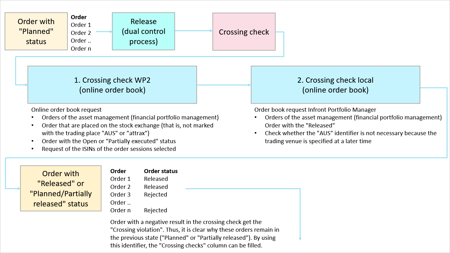 - If this crossing check is licensed for the online order book, the checks of the online order book are carried out first and then those of the local order book integrated in the Infront Portfolio Manager.
