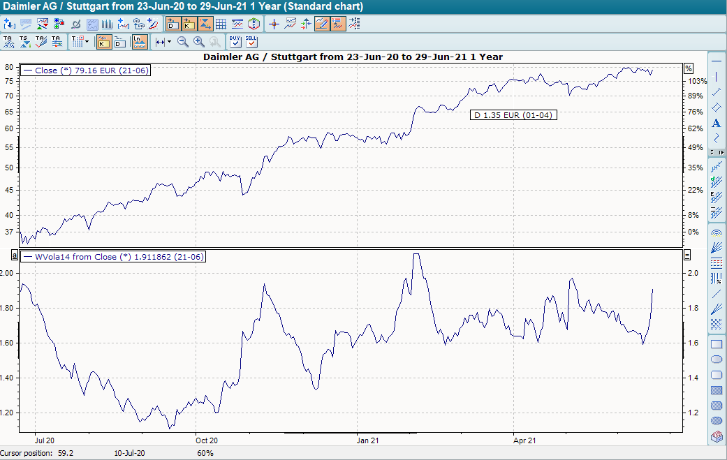 A GD is formed on this true range, whereby Wilder has recommended a simple 14-day GD. The result is the "Average True Range" (ATR). The sequence of ATRs results in Wilder's Volatility. Since the True Range is always positive, Wilder's Volatility is also always positive.
