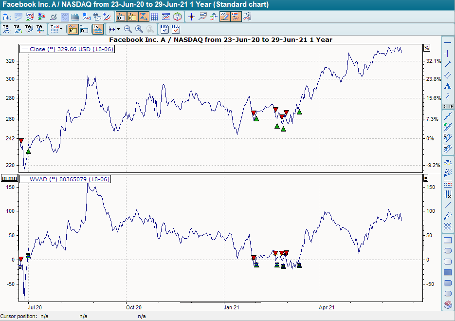 A buy signal is given when the WVAD crosses the zero line from bottom to top, a sell signal is given when the WVAD crosses the zero line from top to bottom.